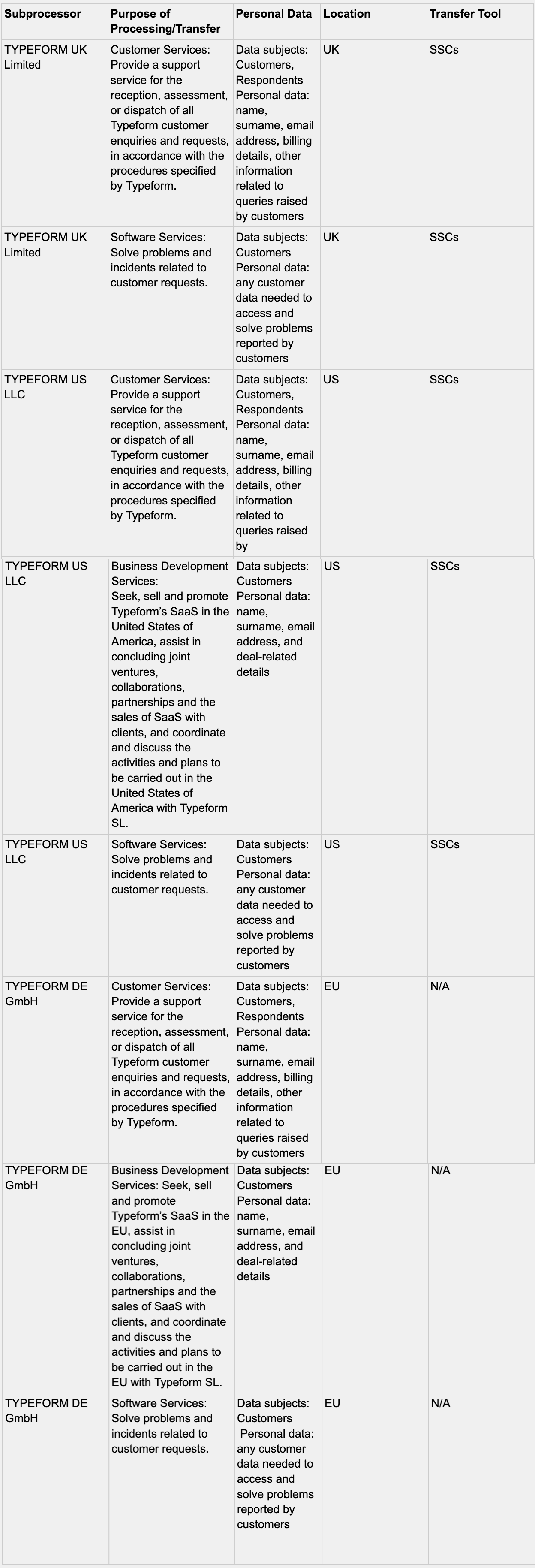 The list below shows the service providers (sub-processors) and subsidiaries we use to deliver our services, where they are located, and a description of their purpose and the tasks they carry out.